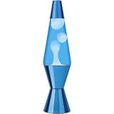 - Sleek blue chrome lamp base and cap; 20-ounce glass globe contains white wax and blue liquid for lava effect