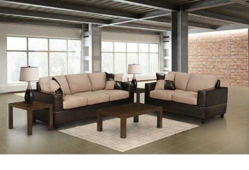 This 7-pcs set includes 1 x 3-seat sofa, 1 x Loveseat, 3 x throw pillows, 2-set of Modern table lamps and 1 x 3-pcs Set of Coffee-End Table. This sofa and loveseat is upholstered in microfiber material on the cushions and back and vinyl on the body and arms. This 7-pcs set all brand new pack in 4 different boxes and ready to assemble. Assembling tools and instructions are included.Available at Amazon Check Price Now!